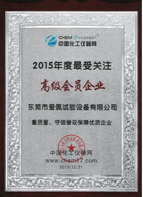 恭喜愛佩科技(全稱:東莞市愛佩試驗(yàn)設(shè)備有限公司)于2015年12月31日被榮獲中國化工儀器網(wǎng)2015年度最受關(guān)注高級會(huì)員企業(yè)、2015年重質(zhì)量、守信譽(yù)雙保障優(yōu)質(zhì)企業(yè)。